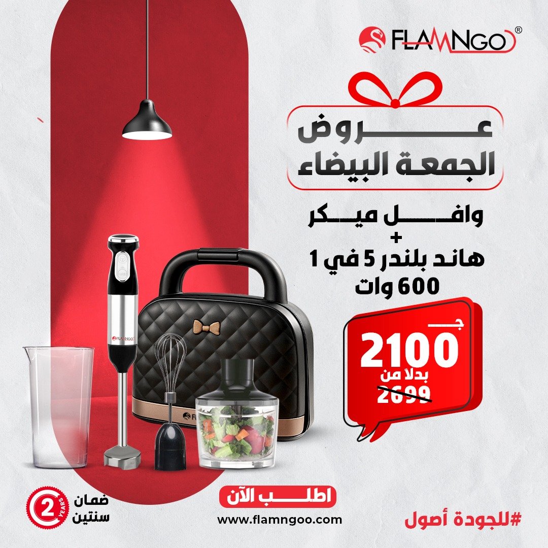 احصل الآن على عرض الجمعة البيضاء المميز من Flamngoo، يجمع بين وافل ميكر أنيق و هاند بليندر 5 في 1 بقدرة 600 وات، بسعر 2100 بدل 2699 جنيه فقط، مع ضمان سنتين.
